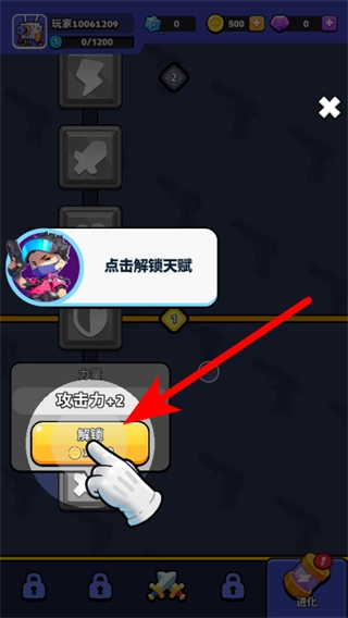 2、进入天赋界面后点击解锁按钮,解锁可增加2点攻击力的力量类天赋,以此提升角色的战斗属性。
