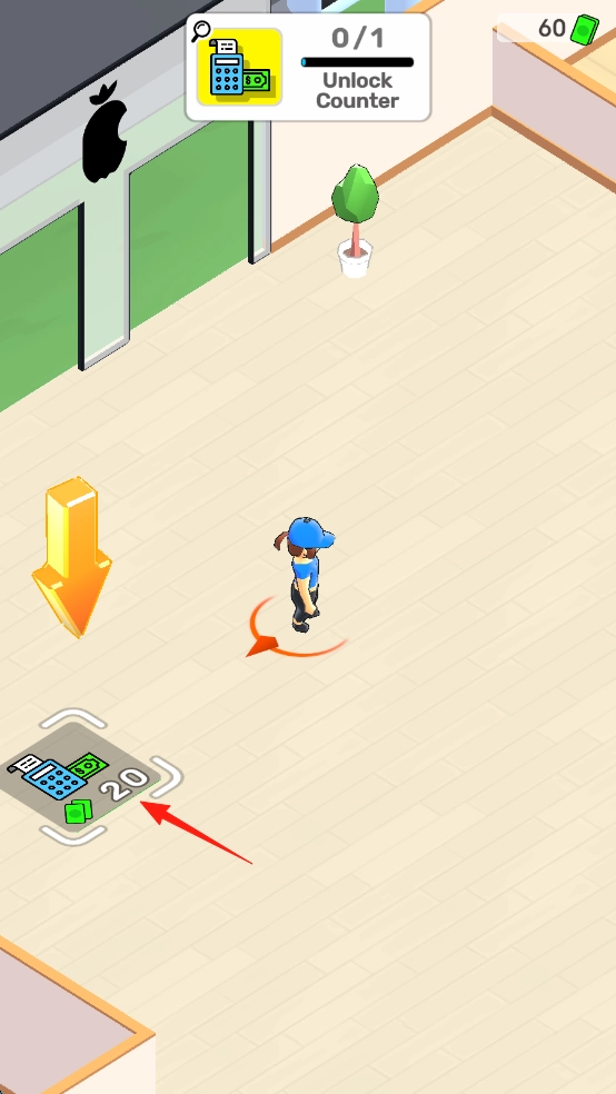 2、按照箭头所指方向,找到标有红箭头的“UnlockCounter”区域,消耗20个资源解锁该柜台,以此来拓展店铺的功能。