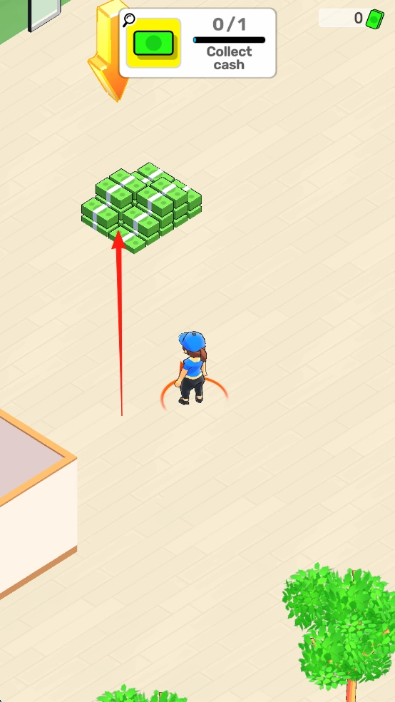 1、操控角色,朝着现金堆(红箭头所指方向)移动,收集“cash”,达成“0/1”的任务目标,以此积累资金。
