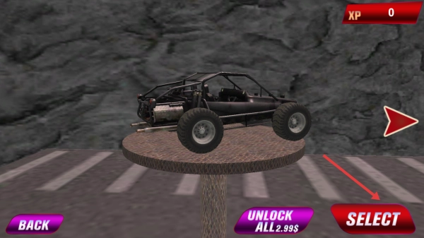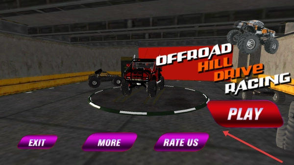 1、点击【PLAY】按钮,进入《OffroadHillDriveRacing》(越野山地驾驶赛车)游戏,选择黑色的越野车并点击【SELECT】确认选择。