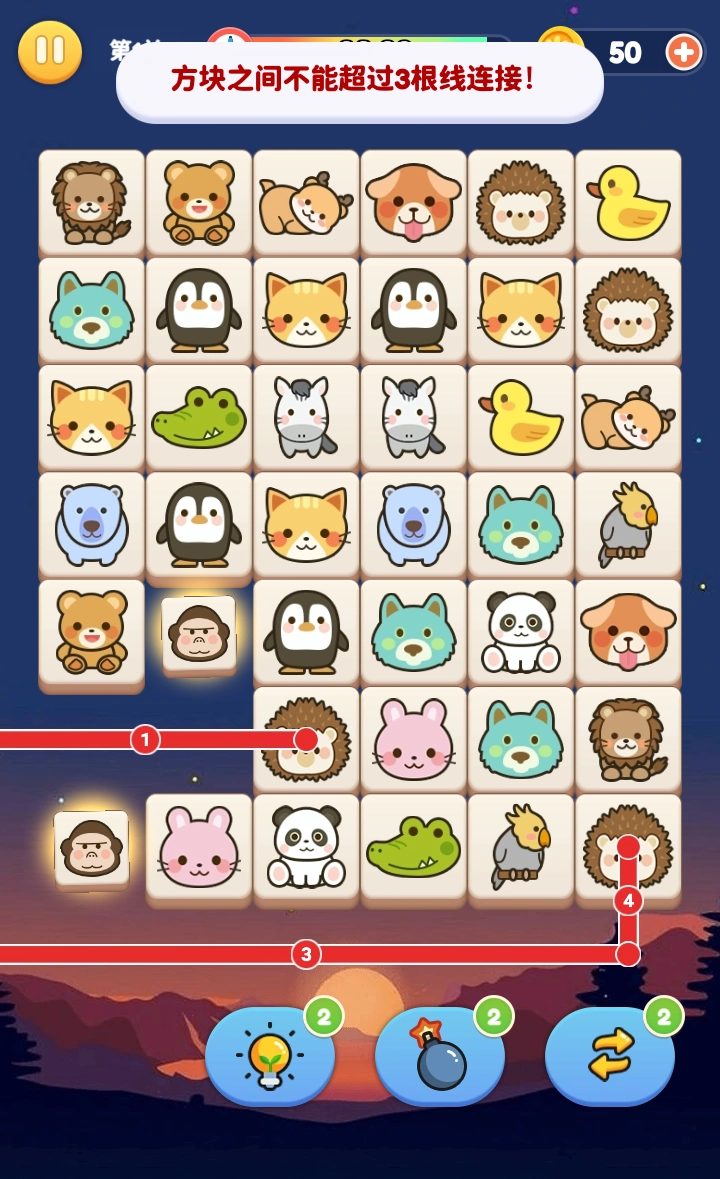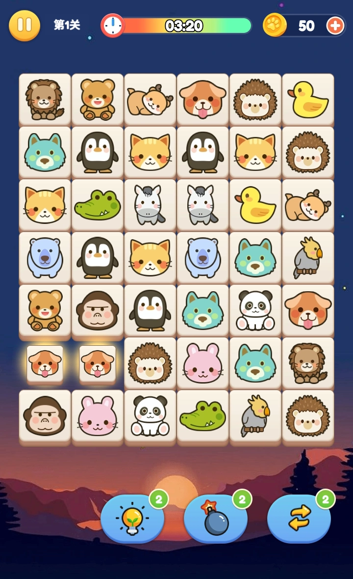 《天天连连看》是一款充满复古韵味的宠物主题连接消除游戏,既还原了经典的连接消除玩法内核,又在画面质感上进行了优化升级。游戏操作简单易懂:只需找到两个相同的宠物图案,通过连线即可完成消除;当把当前关卡内的所有宠物图案都消除完毕,就能顺利解锁下一关。不过要留意,只有当两个相同图案之间的连线转折不超过三次时,才能成功消除哦。要是遇到棘手的关卡难以突破,也无需焦虑——游戏内准备了多样实用的道具,能帮你轻松攻克难关,顺利推进游戏进程。