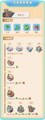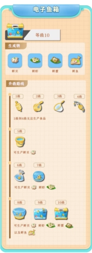 渔线、放线器、渔网、鱼竿、渔桶(可产出鲜贝)、鱼袋(可产出鲜贝和鲜虾)、小鱼缸、鱼缸(可产出鲜贝、鲜虾、鲜蟹)、鱼箱、电子鱼箱(可产出鲜贝、鲜虾、鲜蟹、鲜鱼),这些物品的满级均为10级。