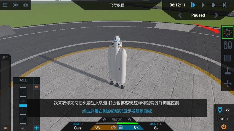 3、此刻,将你的火箭锁定至目标,具体操作是点击屏幕右侧的按钮,以呈现导航球面板。