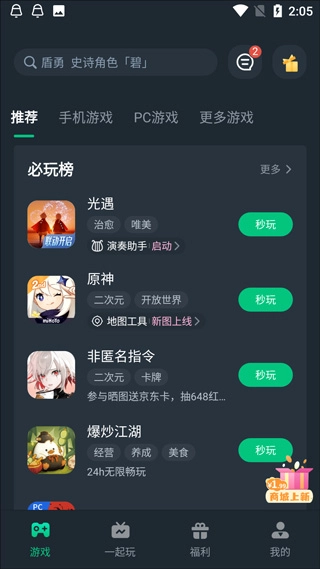2、在游戏界面找到自己想玩的游戏,比如《光遇》,然后点击“秒玩”按钮。