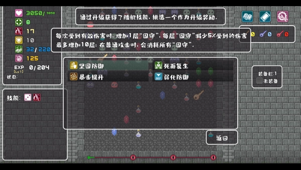 击杀怪物可获取经验,等级提升后便能挑选技能,每次挑选时技能都是随机出现的,选到自己心仪的技能后进行确认即可。