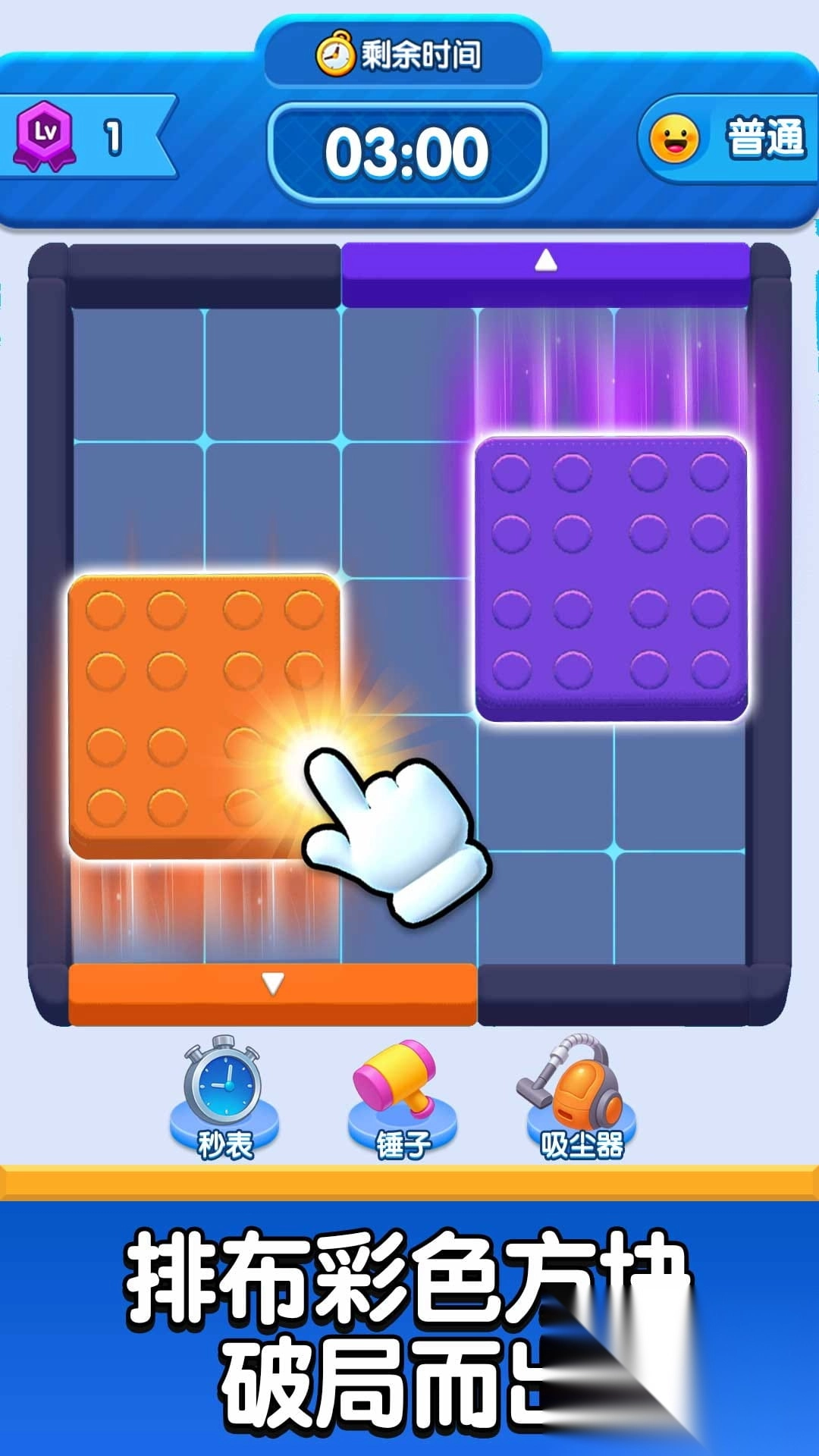 2、提前规划每一步的行动,防止方块被卡住或难以移动,试着逐步清除目标方块周边的阻碍,为它开辟出逃生的空间。