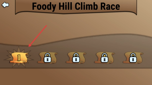 1、点击【START】按钮,进入《FoodyHillClimbRace》(美食登山赛车)游戏,选择处于解锁状态的第1关。
