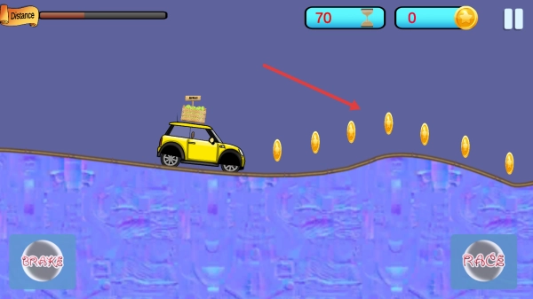 2、驾驶黄色小车在山地赛道行驶,通过【BRAKE】(刹车)和【RACE】(加速)控制速度,收集金币。