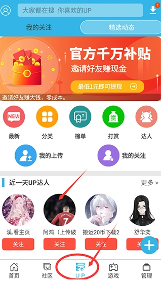 1、打开应用,进入主页面后选择“up”功能按钮,点击进入该功能页面,找到达人排行板块,选择图中所示的达人。