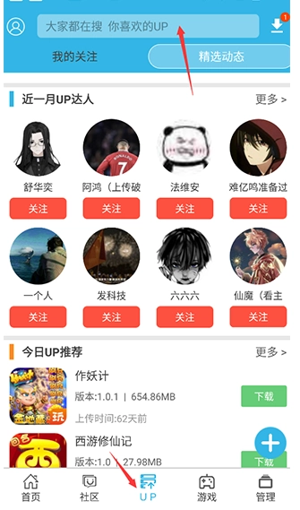 4、要是想找到自己心仪的游戏应用,那也得点击“up”功能按钮才行。