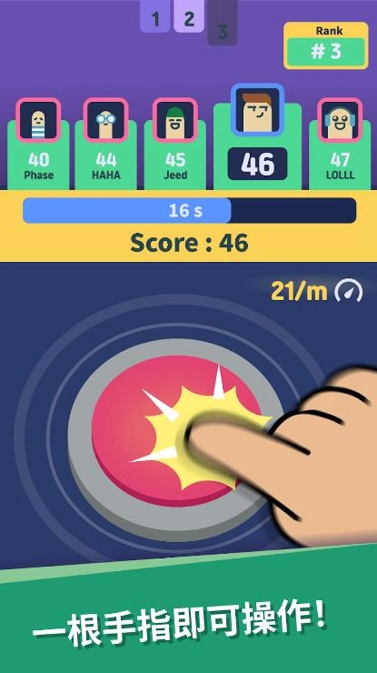 不需要复杂操作,每个人都能在短时间内掌握游戏玩法,这让它很适合休闲时刻或和朋友一起玩。不管是午饭后的休息时间,还是等待某事的间隙,你都能随时拿起手机,和朋友们来一场快速的手指对决,赌点零食、饮料,赢的人就能拿走奖励!就算没有伙伴,单人模式也能让你独自练习,提升速度和技巧。