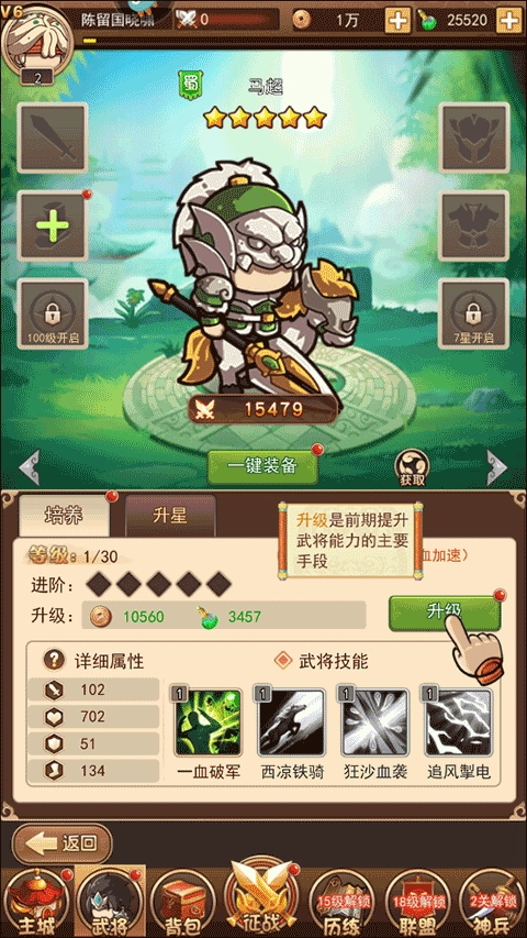 5、接着只需选择并点击“升级”选项,就能以最高效的方式培养武将了。