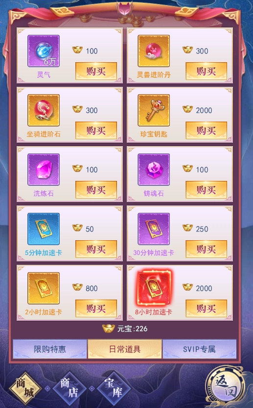 玩家每日获取灵气没有上限,只要战力足够高,就能通过参与各类功能玩法、活动来获得大量灵气,还能在商城的日常道具板块无限购买灵气。