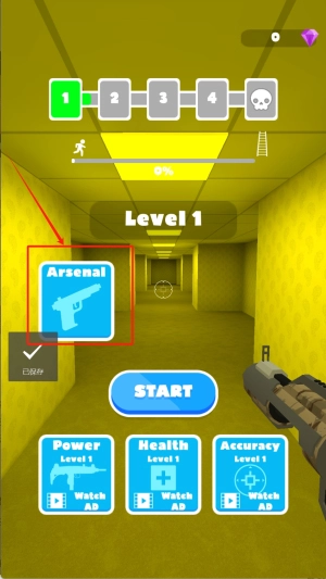 进入游戏后选择“Level 1”难度,留意左下角武器栏里的手枪图标,点击“Arsenal”即可切换其他武器,为战斗做好准备。