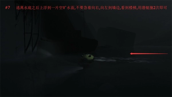 7、从水底逃离后上浮到一片空旷水面,别急着往右边去,先向左游到墙边,能看到楼梯,操控潜艇撞击几次就行。
