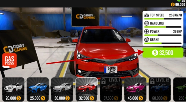 2、接下来可以用金币购买一辆自己心仪的汽车,每款汽车的性能和驾驶体验都有所不同,你可以直接点击汽车头像查看详情。