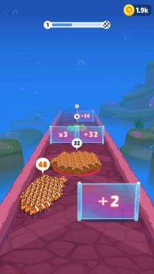 1、玩家操控海洋生物,在跑酷路径中持续吞食其他海洋生物,以此增强自身的实力。