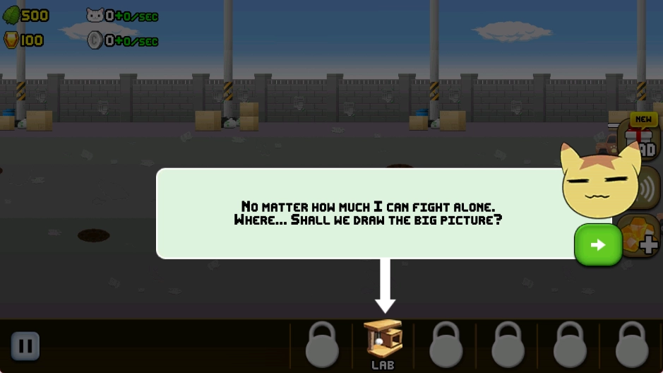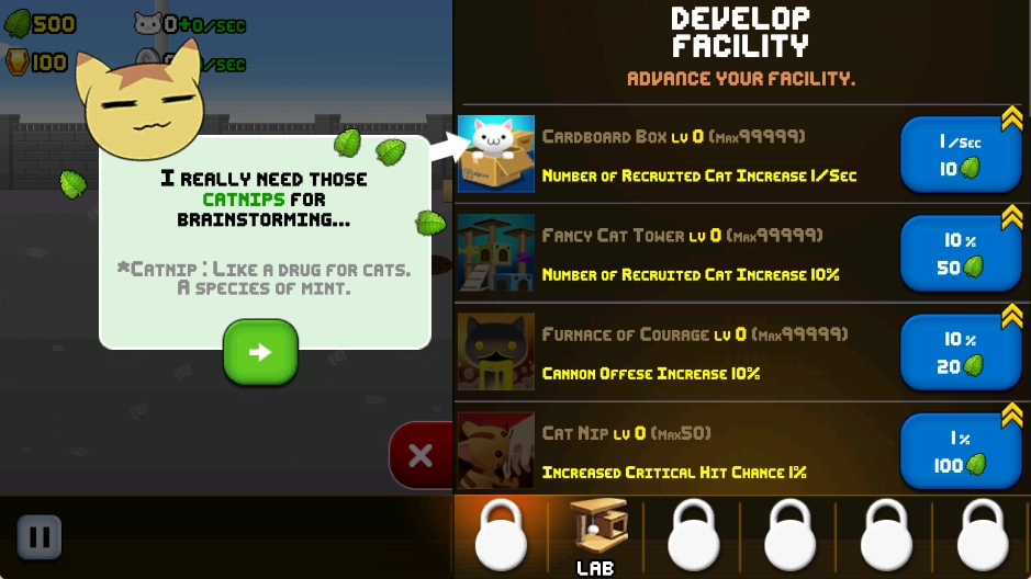 2、闲置科技文明:游戏设定于一个融合蒸汽朋克风格与像素美学的架空世界,猫咪们依靠收集各类资源,持续升级自身的武器装备与防御体系。