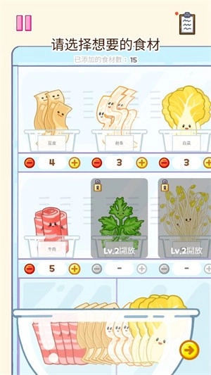 3、在食材选择界面,用户可以自由挑选食材,若挑选的是订单中顾客指定要求的食材,还能获得额外奖励。
