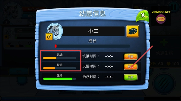 3、在【幼崽信息】界面,通过【喂食】【玩耍】操作提升幼崽的【饥饿】【快乐】状态,加速其成长进度。