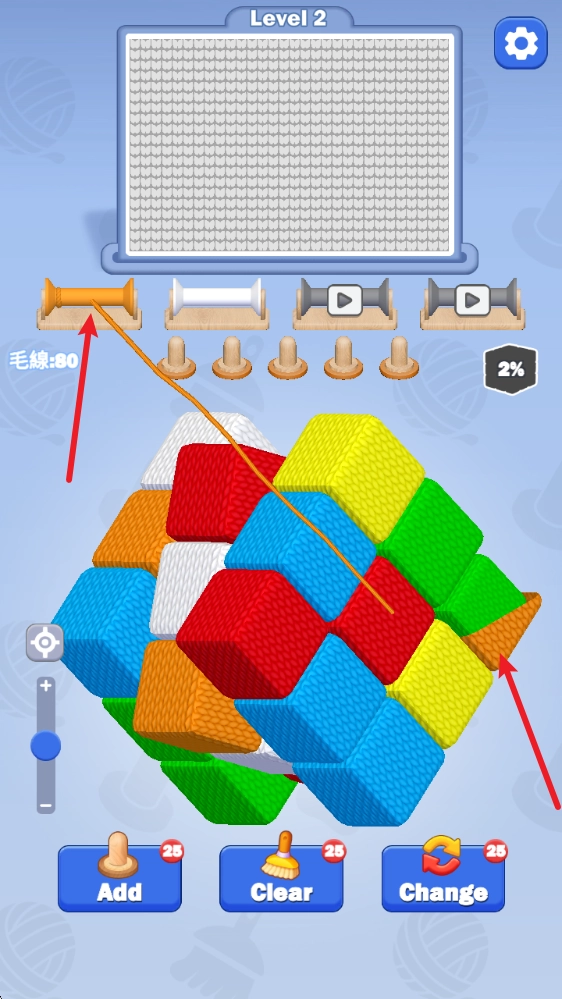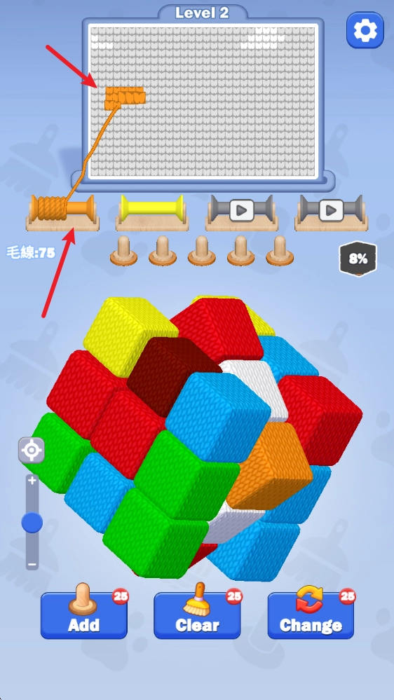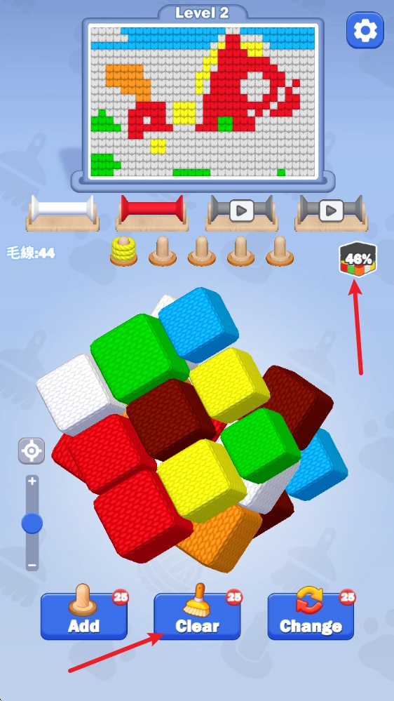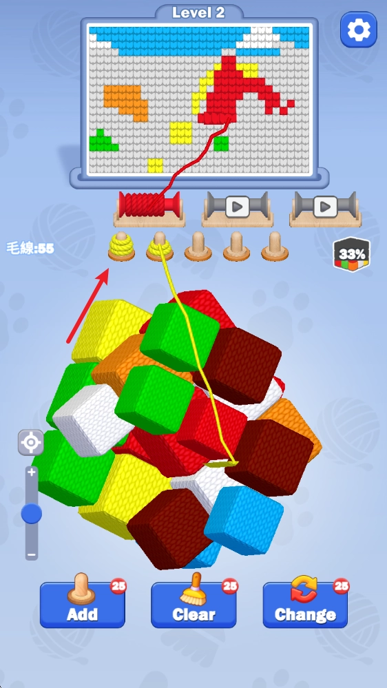 1、游戏中根据上方目标颜色,点击对应的毛线即可收集。