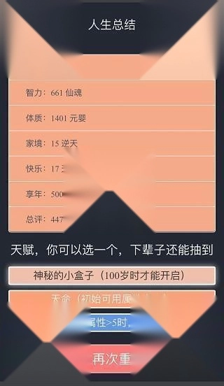 3、给玩家们提个建议:要是想活到100岁,选“神秘的小盒子”这个天赋准没错,选了之后就专心提升体质,全力朝着活满百岁的目标努力;要是不选这个天赋,那就把重心放在智力上,去买乞丐手里的仙法,不过体质也得兼顾着,不能落下。另外,修仙的时候千万避开“多重人格”和“克苏鲁”这两个选项。