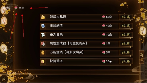 3、我们会发现左上角实现了无限鲜花的效果,可以将一系列道具一网打尽。