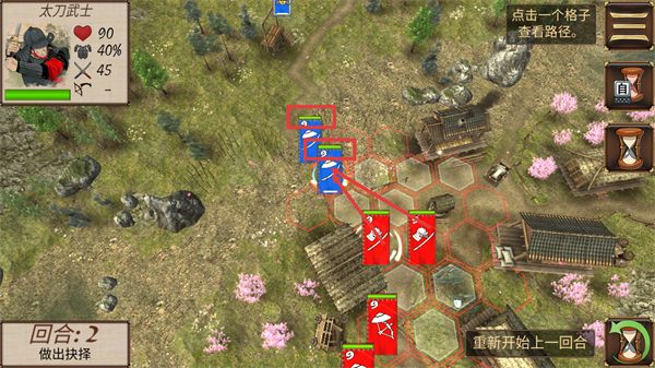 2、操控【太刀武士】单位,点击格子查看路径,利用六边形移动区域靠近敌方标识单位发起攻击。