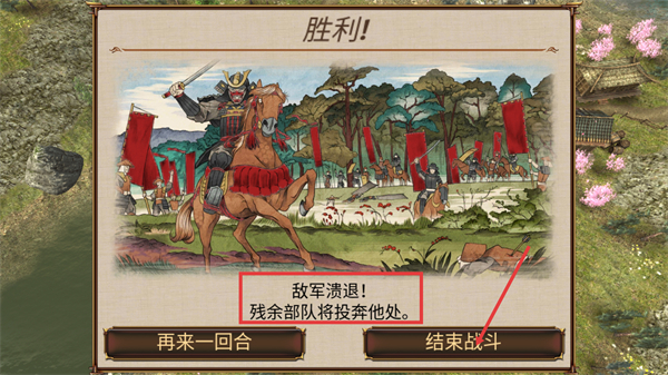 3、战斗胜利后出现【敌军溃退】提示,可选择【再来一回合】继续战斗或【结束战斗】结算奖励。