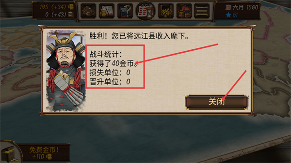 4、占领区域后可获得【40金币】,查看【战斗统计】确认损失与晋升情况,点击【关闭】返回主界面。