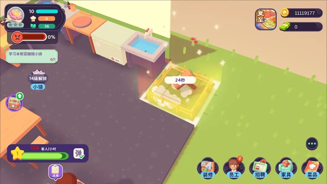 1、扩地:当发现餐厅旁存在可扩地区域时,点击该区域即可启动扩地流程,待倒计时结束后,便能顺利完成地块扩建,从而增加餐厅的使用面积。