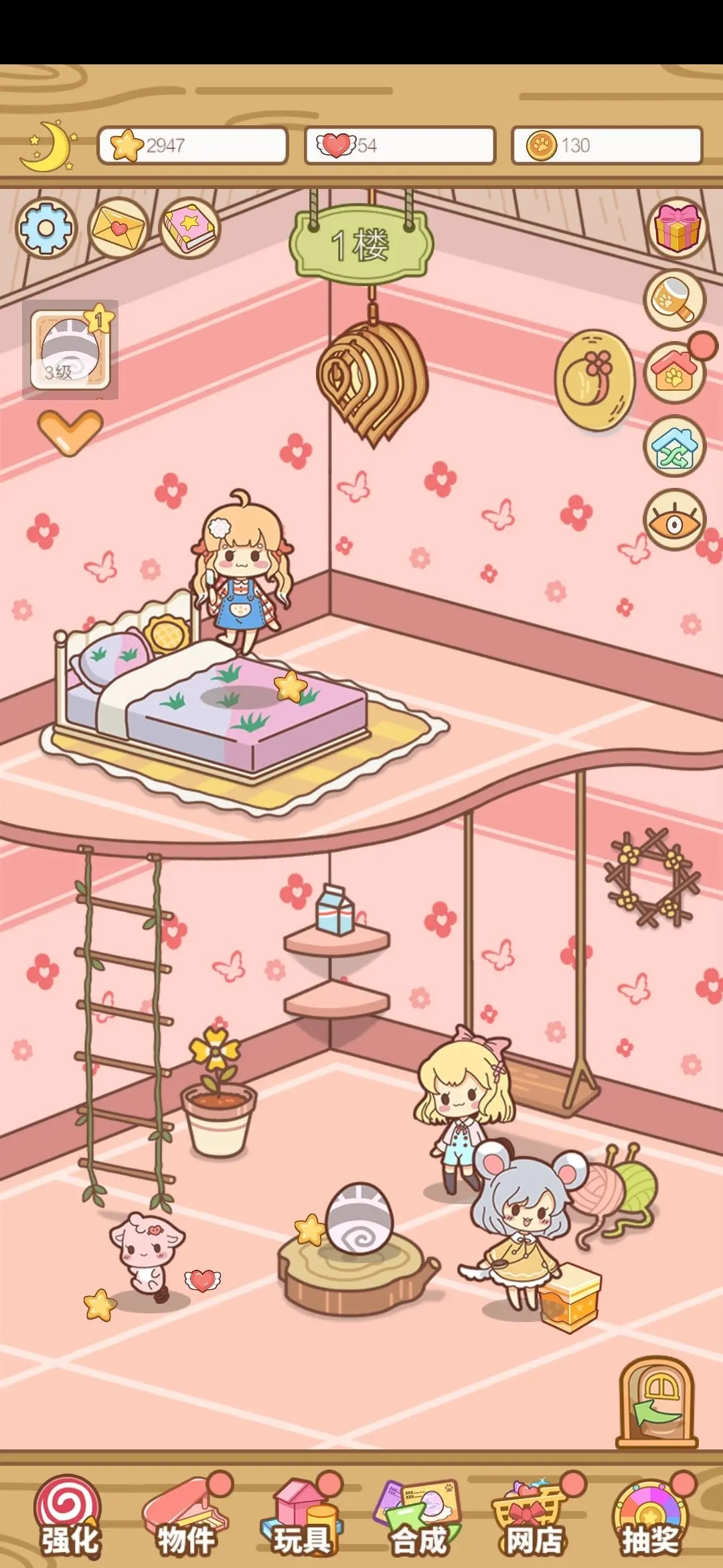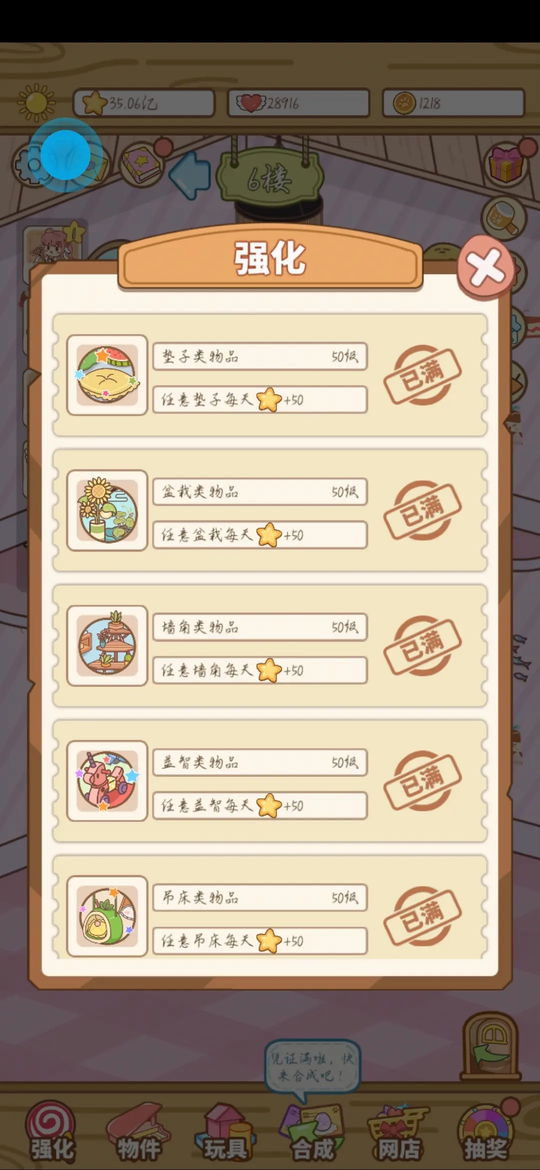 家具可以直接一键升级,不用省着,大家看清楚家具是用星星兑换的,星星赚起来很快,不用着急