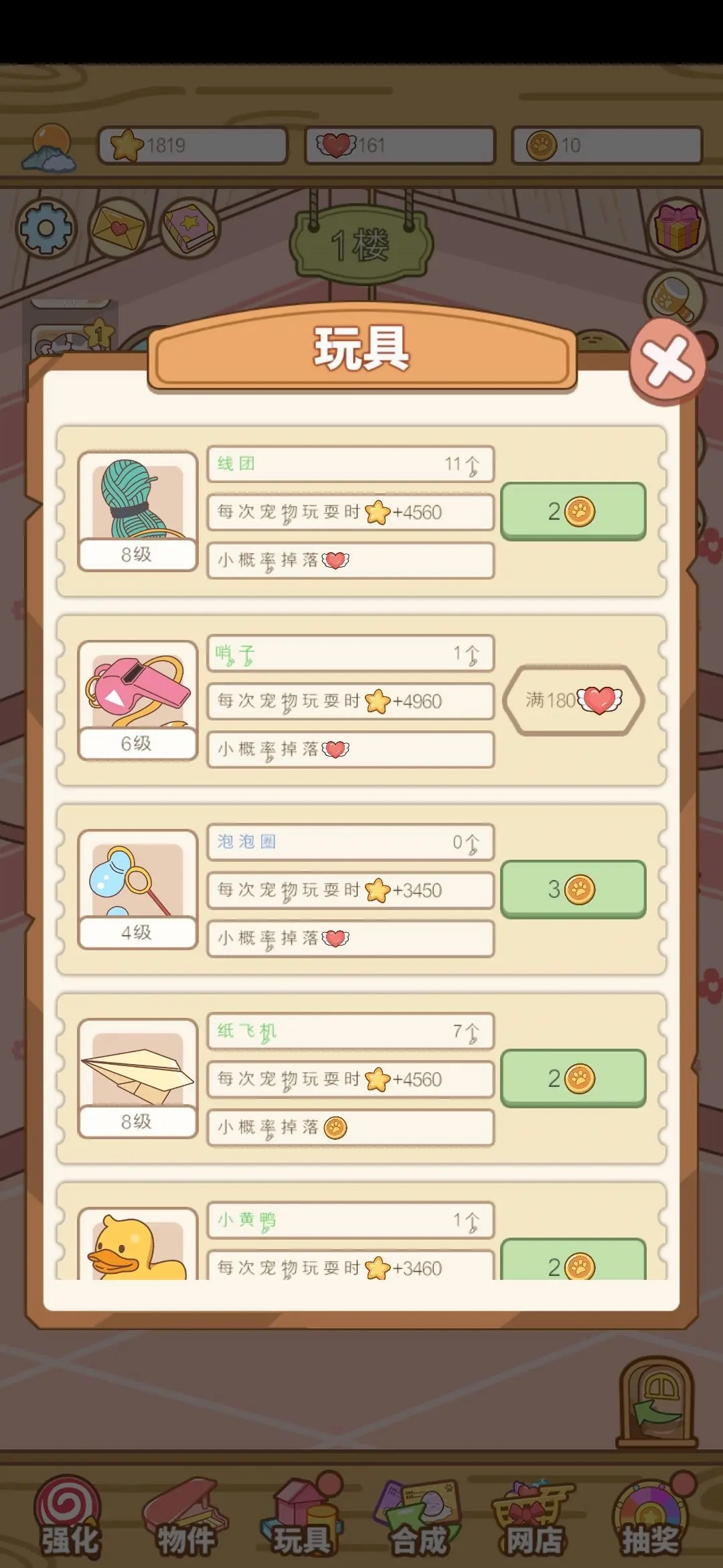 每种玩具的功能都标注清楚了,能升级的话就马上升级!(要是金币不够,具体先升级哪个可以根据你的需求来定)