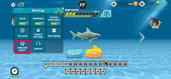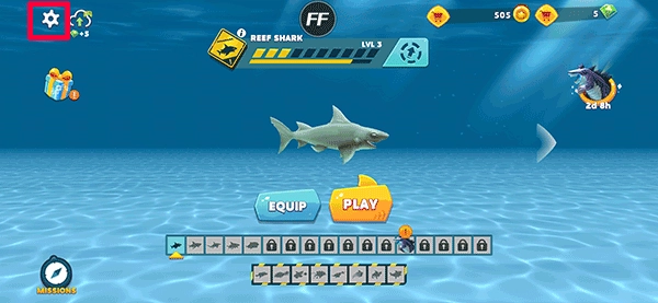 1、启动饥饿的鲨鱼进化手机版,在游戏主界面找到并点击左上角的【齿轮】图标;