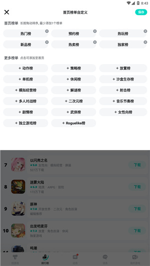 3、玩家还可以点击右上角的图标,自行定义榜单,比如设置动作榜、策略榜等不同类型的榜单。