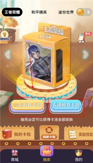 4、点击“去获取”后,需在当前页面通过“金币开卡包”或“看视频开卡包”的方式进行抽取。