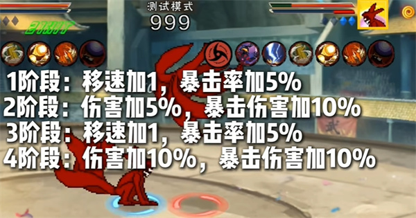四尾鸣人在遭受攻击时会逐渐变得愤怒,愤怒程度共分为4个阶段,每个阶段对应着20%的血量减少,具体的对应情况可参考下图: