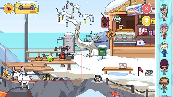 3、点击右上角的第一个头像,能够添加表情;点击第二个头像,则可以挑选人物并放置到商店的雪地上。