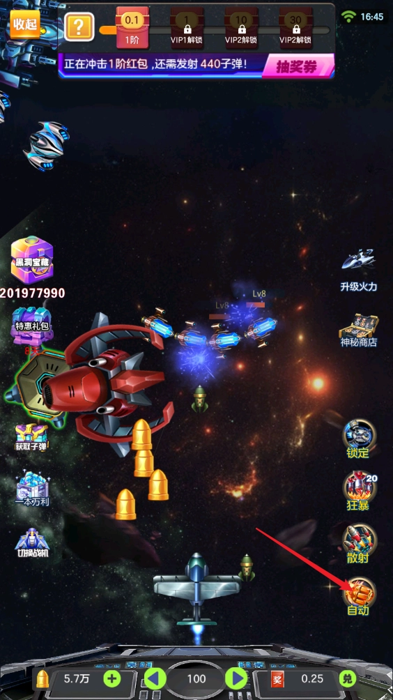 1、按住飞机就能操控它移动并射击,右下角还能选择自动模式。