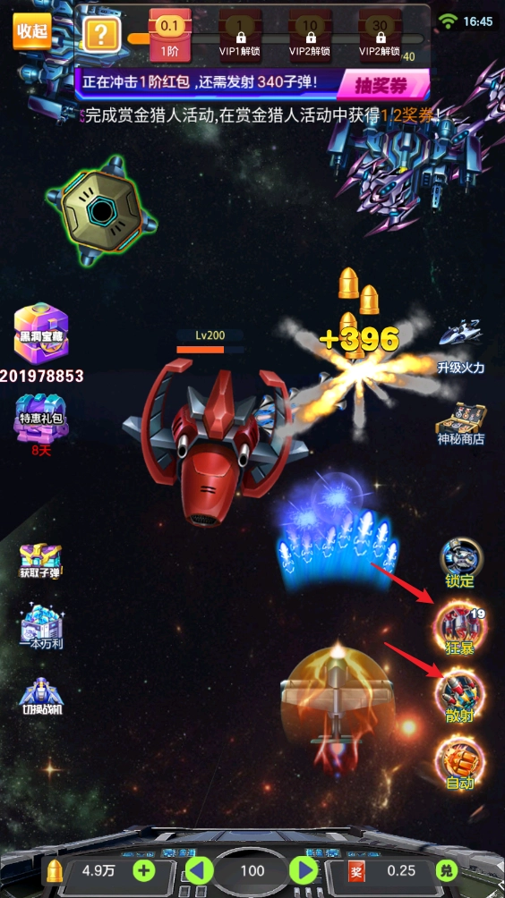 3、玩家也能亲自操控飞机进行射击,感受一场紧张刺激的飞机大战,在享受欢乐的过程中,还能获得红包奖励。