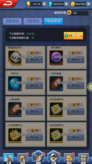 巅峰勋章可在商店兑换各类稀有道具,其中包含金色英雄碎片。该商店分为初级、中级和高级三个等级,而中级商店与高级商店需达到特定档位方可解锁。