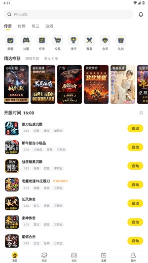 打开盒子后,最上方划分成了多个板块,像传奇、传世、传三之类的都在其中,板块下方还设有新服、任务、交易等功能入口。