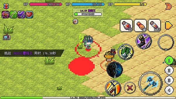 2、打boss时射手先把强化叠到1000(反正够用就行),先装备上雪原城售卖的回1000血的药,之后就能走位输出了。后撤这个技能带有无敌效果,能必定闪避伤害。