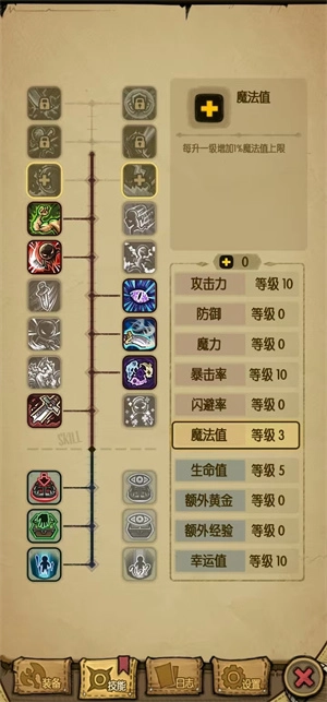 3、魔力流:续航能力最为出色的流派,加点顺序推荐10点魔力→10点魔法→7点闪避→10点幸运→5点生命。到了游戏后期,建议大家选择并点亮荆棘装甲与割裂技能,这两个技能能让符石的伤害得到不错的提升;装备方面则优先挑选带有魔力词条的。