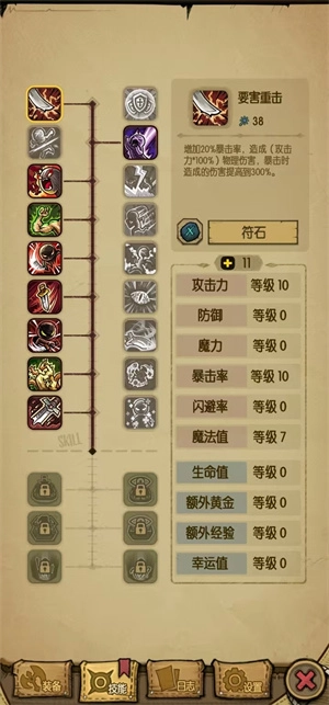 2、物理流:这个流派的特点是生存能力最弱、药品消耗最大,加点顺序建议为10点攻击→10点暴击→7点闪避或魔法→10点幸运→5点生命。选择该流派的玩家需要提前储备充足的药水,装备方面优先挑选带有穿透和攻击属性词条的。