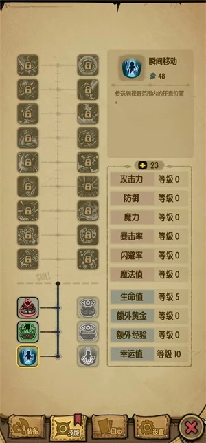 4、双休流:这是后期最强势的流派,加点顺序推荐10点攻击→10点魔力→7点魔法→10点幸运→5点生命。该流派建议在积累到一定装备基础后再转型,因为双休流在前期缺乏装备支撑时会比较弱势。装备选择上优先考虑带有魔力和穿透词条的。