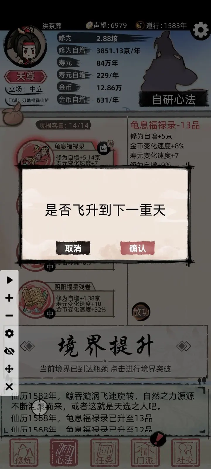 4. 道友系统基本是个摆设,弹出的所有事件选第二个“否”就行,选其他选项纯粹浪费时间;云游到后期即便有钱了也没什么用,属于鸡肋功能;钓鱼更是既耗时收益又低。第一世可以尝试玩一下,用来攒点初期启动资金,后面就没必要再花精力在这些上面了。