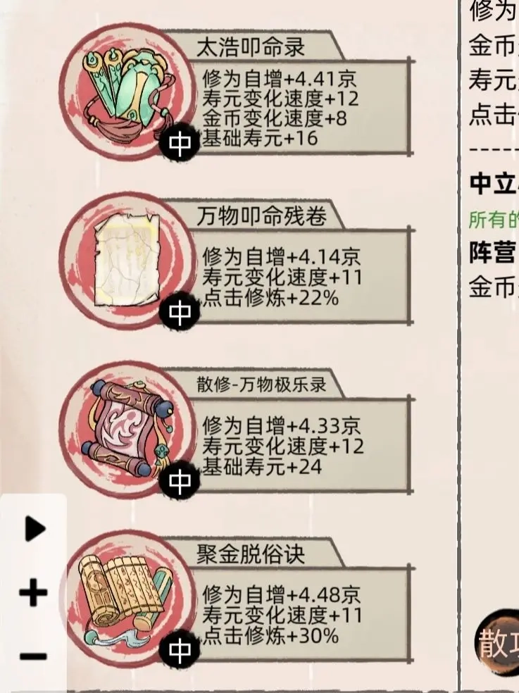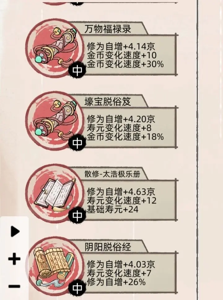 2. 钱是关键,有了钱就能放开手脚,所有加修为、加金币的道具都果断入手,拍卖行里山泉水、自在心、悟灵心、悟道灯、太阳裂盘、流水这些是必买的——流水的加成很高,虽说扣除九成寿元看着多,但升一次体质就能补回来,早用早受益;接下来我截图里那几样丹药也得必买,其他一些加修为但收益低的道具,不用特意找,碰到了顺手买就行。另外,像那种有年限限制(比如两百年的自增加成)的加成,直接忽略掉,没什么用。