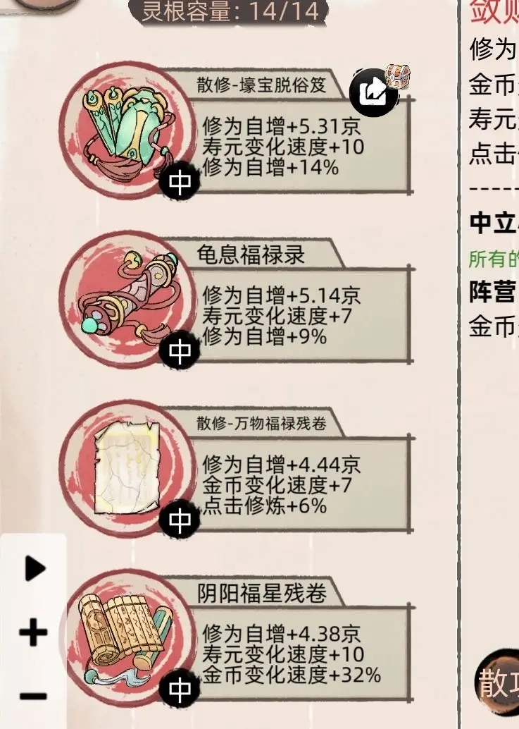 1. 第一世不用急着赶进度,毕竟这一世的核心是打好基础——你得在这一世攒足后续所有轮回都能用的启动资金。其实操作很简单,主要靠挂机存钱就行。虽然柜台升到天级、手续费最低时,可以买法宝倒卖赚差价,但这个方法太耗精力,不太推荐。等后面金币加成到四五百的时候,挂机一晚上就能有四五百万金币入账了。