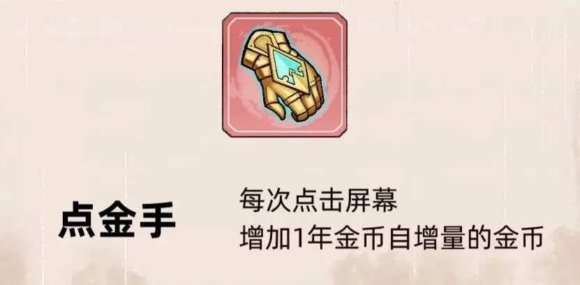 点金手:每次点击屏幕,增加1年金币自增量的金币